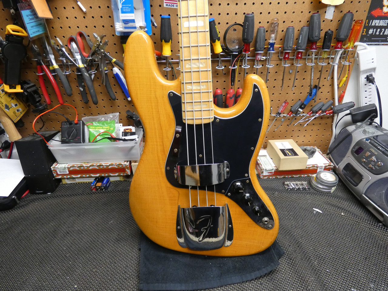 We have a very nice, all original Jazz bass. Late assembled 1975 with a 679xxx serial. Electronics date to very early 1976. Bass is 100% original including the case that has a replaced latch. Only thing not factory is the tail pickup was JUST rewound by Tom Brantley - If he's good enough to do Geddy's work, he can certainly do mine. The rewind is exact. Bass shows checking and typical player wear for a 50 year old bass and the back has some buckle rash but didnt cut the finish. Ash body gives it the spank these basses are known for.