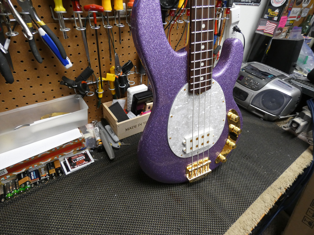 The condition on this bass is just about flawless. The paint and wood is a 10 out of 10. The gold hardware is about a 9.5 out of 10. The action and playability is off the charts. Silly low action, NO dead spots, killer tone. Roasted maple neck with a sought after rosewood board. GET THIS - 8.1 lbs! Has the orig hard EBMM case. For you eagle eyes, yes there are strap locks BUT the orig gold strap buttons will be reinstalled. Every piece of metal is gold plated - the hardware, the plate, pole pieces, truss rid spoke wheel. The color on this thing is insane. It pops in the sunlight and inside lighting. She plays and sounds as good as it looks. Want the best EBMM bass we ever had in, here it is.