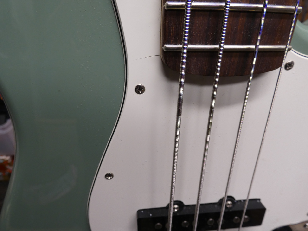 Just in, we got a super nice G&L JB that was one of the last G&Ls ever built. Nice clean bass but has a scratch on the bottom edge about an inch long and its not wide. The pickguard also has a tiny split - both items are in the last 2 pics. The bass plays and sounds awesome and other than those 2 items, she's pretty clean. No docs were received when we bought the bass. We put her in a brand new Fender gig bag. Ready to be enjoyed and you will enjoy this bass!